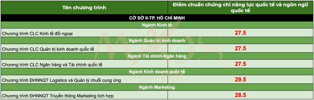 Bảng 3.2: Điểm chuẩn quy đổi chứng chỉ quốc tế và ngôn ngữ quốc tế của FTU tại cơ sở II – TP. Hồ Chí Minh 2024