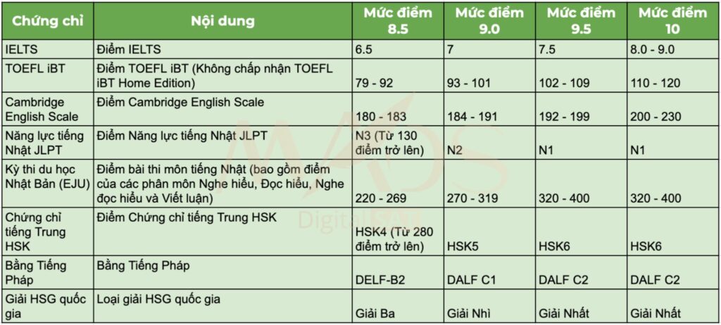 Bảng 4.1: Điểm quy đổi chứng chỉ ngôn ngữ quốc tế/giải HSG quốc gia (chiếm 10/30 điểm)