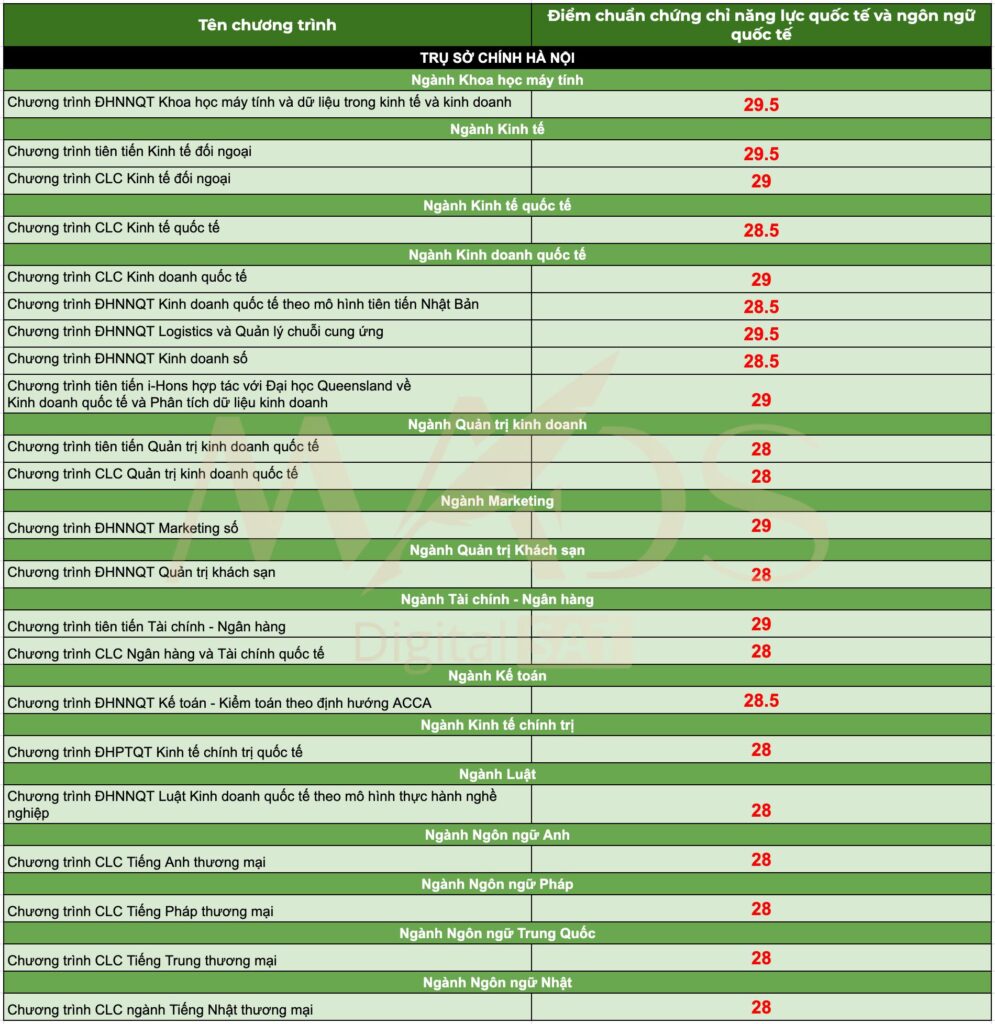Bảng 3.1: Điểm chuẩn quy đổi chứng chỉ quốc tế và ngôn ngữ quốc tế của FTU tại trụ sở chính Hà Nội 2024